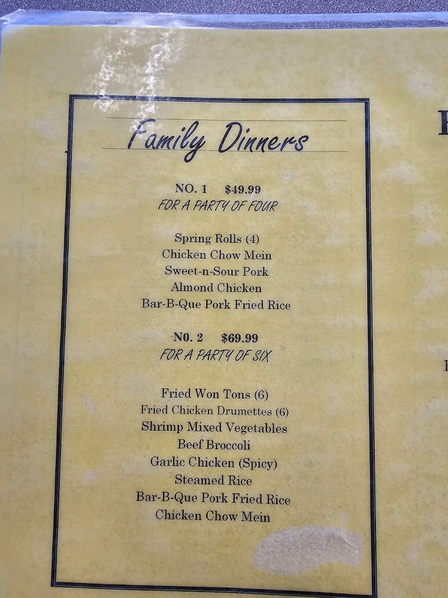 Overall, the menu focuses on delivering hearty, familiar Chinese cuisine in a setting that invites you to enjoy dependable, satisfying meals any day of the week.